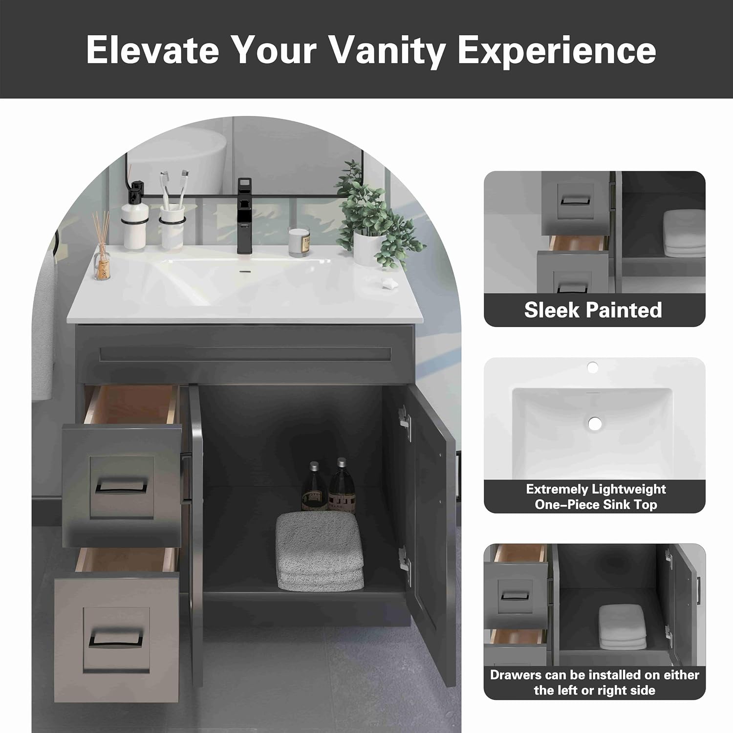 36" Grey Shaker Bathroom Vanity with Sink – Solid Surface One-Piece Top, Soft-Close Doors, Polyurethane Nano Resin Sink, Pre-Drilled Faucet Hole, Modern Bath Vanity Cabinet Set