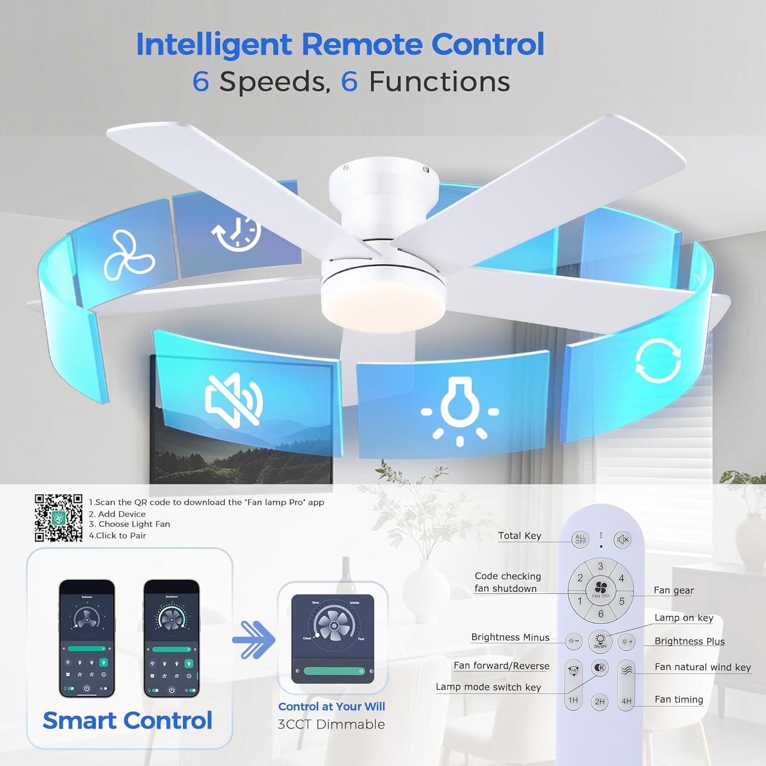 • Customizable Light & Breeze for Total Comfort: The light features dimmable, stepless dimming and 3 color change options (Warm/Neutral/Cool White) for any mood. The fan offers 6 speed settings for your ideal breeze. Enjoy complete personalization with the included remote/APP.