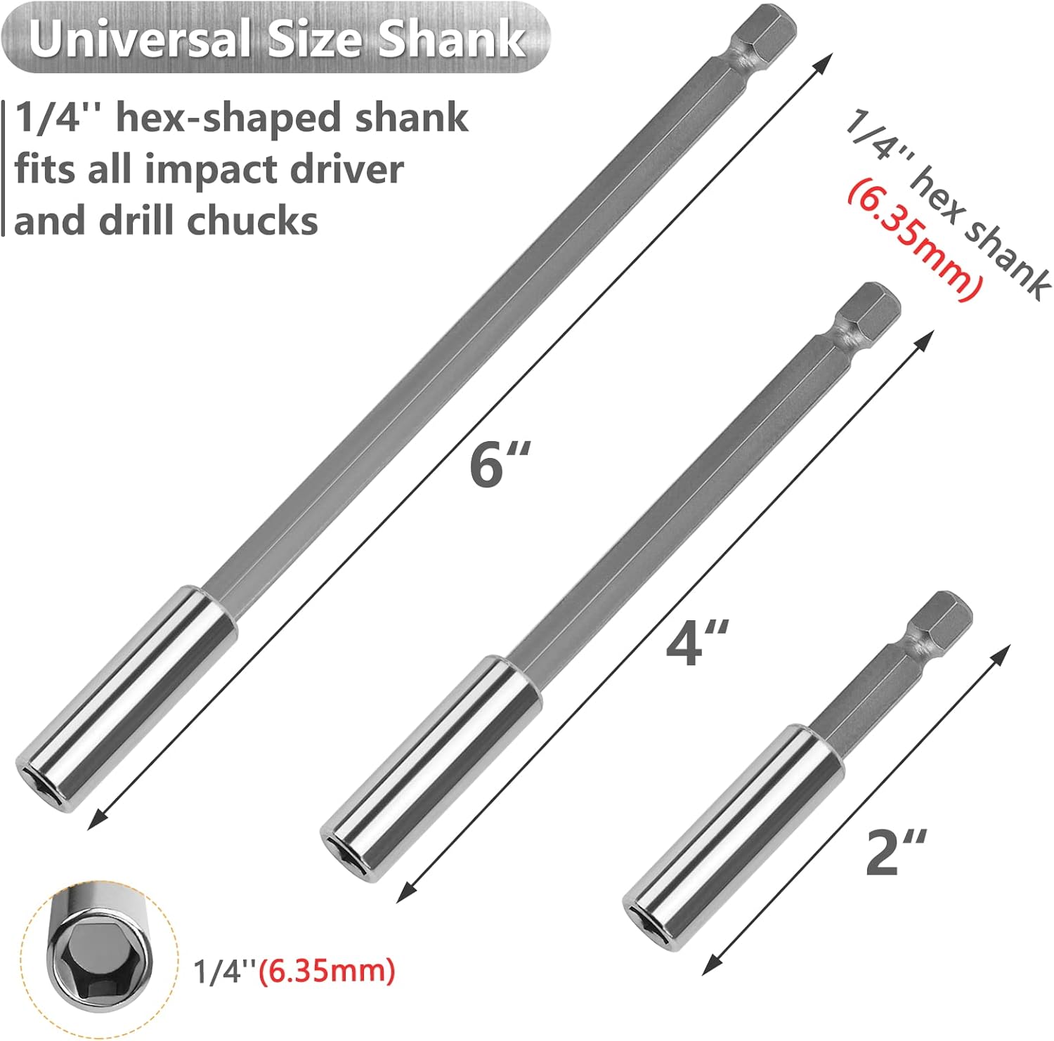 6 Pieces Magnetic Bit holder, 2, 4, 6-inch Extensions, Magnetic Extension Socket Drill Bit Holder 1/4" Hex Power Tools Durable and Easy to Use: Fast, fastening; durable, quick change with high efficiency With Strong Magnetism: Interface has a locking mechanism, built-have magnetic, limit the screwdriver's position and adjustable Unique Design: Two-piece design is engineered for maximum versatility Specification: Material: chrome vanadium steel (CR-V) Length: 2"(60mm),4"(100)mm,6"(150mm) Shank: 1/4" hex shank (6.35mm) Package include: 2 x 2'' Magnetic Bit Holder Extension 2 x 4'' Magnetic Bit Holder Extension 2 x 6'' Magnetic Bit Holder Extension Kindly Note: ❣ Only for single head drill! ❣ Only the bottom of the hole part is magnetic, the hex shank is NOT magnetic! ❣