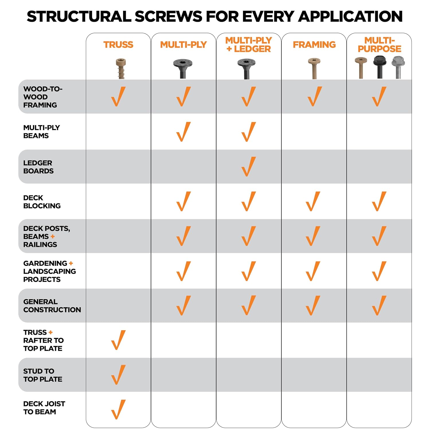 Skip pre-drilling and enjoy fast starts with CAMO Multi-Purpose Flat Head Structural Screws. They start fast, drive easily and seat flush in deck posts, beams, handrails and other exterior projects. They are third-party tested and certified IBC and IRC code-compliant and are an ideal replacement for traditional. lag screws and through-bolts. These screws feature our industry-leading PROTECH Ultra 4-layer coating system, offering superior corrosion resistance for long-lasting connections. Use our CAMO Multi-Purpose screws for deck posts, beams, handrails, gardening and landscape projects and other general construction projects.