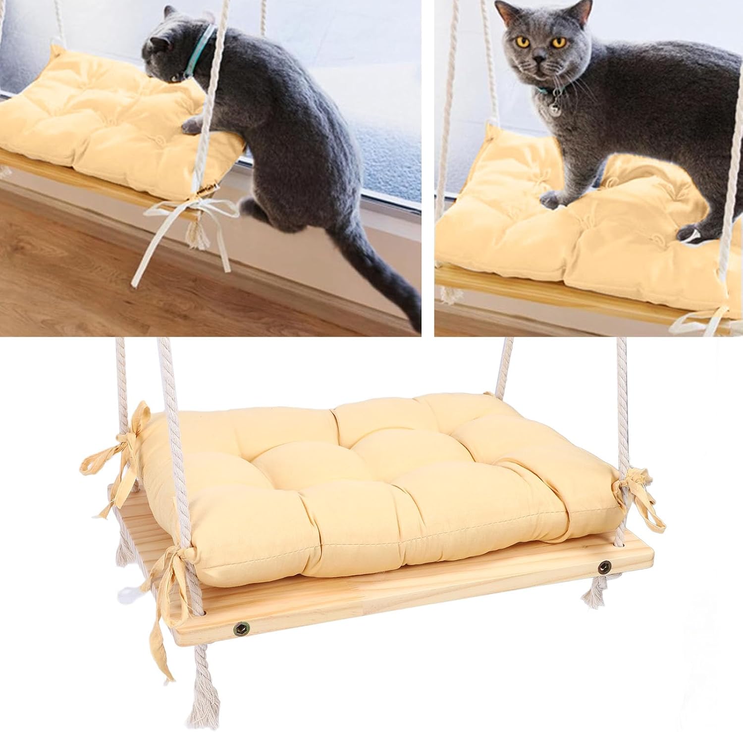 [STURDY WOOD CONSTRUCTION]: Our window cat bed is crafted from pine wood, providing a secure and stable resting place for your feline friend.[HANGING DESIGN]: The versatile design fits precisely on any windowsill, easy to suspend and space-saving, making it an ideal addition to your home.[COMFORTABLE HAMMOCK STYLE]: The hammock design allows your cat to lounge comfortably and observe the outside world, keeping them entertained.[WARM AND COZY]: Designed for autumn use, this cat window shelf offers warmth and comfort, providing a snug area for your cat as the weather cools down.[MULTI FUNCTIONAL]: Not just a cat bed, its versatile design can serve as a hanging bed or comfortable corner, meeting your cat's varied resting preferences.Spec:Item Type: Cat HammockMaterial: Pine woodPackage List:7 x Accessories1 x Cushion