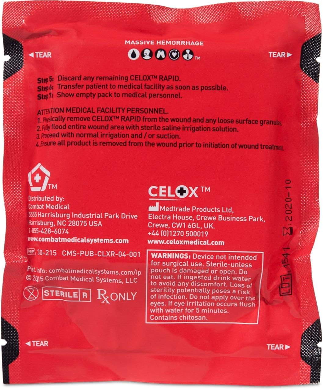 NSN# 6510-01-623-9903 Celox RAPID is the fastest acting hemostatic dressing, reducing treatment time and blood loss. It packs faster, requires minimal post-application compression, reduces blood loss and provides greater stability in evacuation compared to traditional products. Celox RAPID gauze can be rapidly applied to a wound within half the time of competitive devices. This product has been proven in vivo testing to stop major arterial bleeding by coagulating blood within 1 minute, reducing additional blood loss. Celox RAPID gauze is suitable for: Severe high pressure bleeding Arterial and venous bleeding Bullet, blast, knife and shrapnel wounds Wound packing All topical bleeding wounds Dimensions: 3"W x 3.4"H x 0.75"D (packaged) Dimensions: 3"W x 5'L (gauze) Weight: 1.2 oz