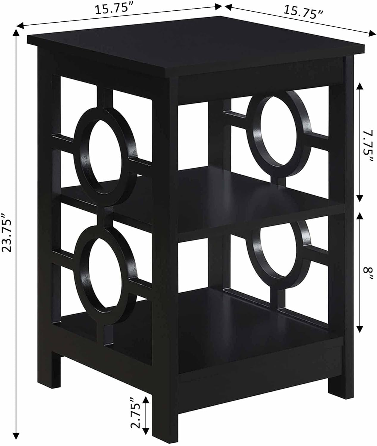 Unique and stylish; the Ring End Table by Convenience Concepts will bring your home decor to the next level. This contemporary piece displays a well thought out construction that combines a clean lined silhouette and two circle cut outs that adorn each of the side frames. It also features three ample shelves for all your storage and display needs. Showcase your favorite books or store your living room essentials; or why not do both! The versatility of this three tier unit is limitless. The shelves were crafted from particle board that is finished with melamine and non lead based paint; making them easy to clean. Frames and legs were fashioned from particle board and finished with non lead based paint; making them sturdy and long lasting. Add to your living room; entryway or to your den; and witness as this item enhances your current decor. Bring home today and enjoy its simple and fast 5 step assembly! Want the complete look? More furniture pieces from the Ring Collection by Convenience Concepts are available. They come in multiple finishes; ensuring the perfect fit for your home. Each sold separately.
