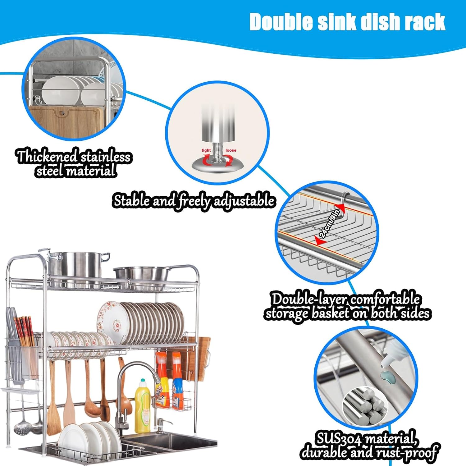 • 304 Stainless Steel, Durable and Rust-Resistant for Greater Peace of Mind: This over-sink dish rack is crafted from high-quality 304 stainless steel, ensuring superior quality from the frame to the basket. This rack effectively withstands the harshest kitchen conditions, eliminating the risk of oxidation and deformation caused by accumulated water. Its service life far exceeds that of standard racks, ensuring long-lasting, reliable kitchen storage.