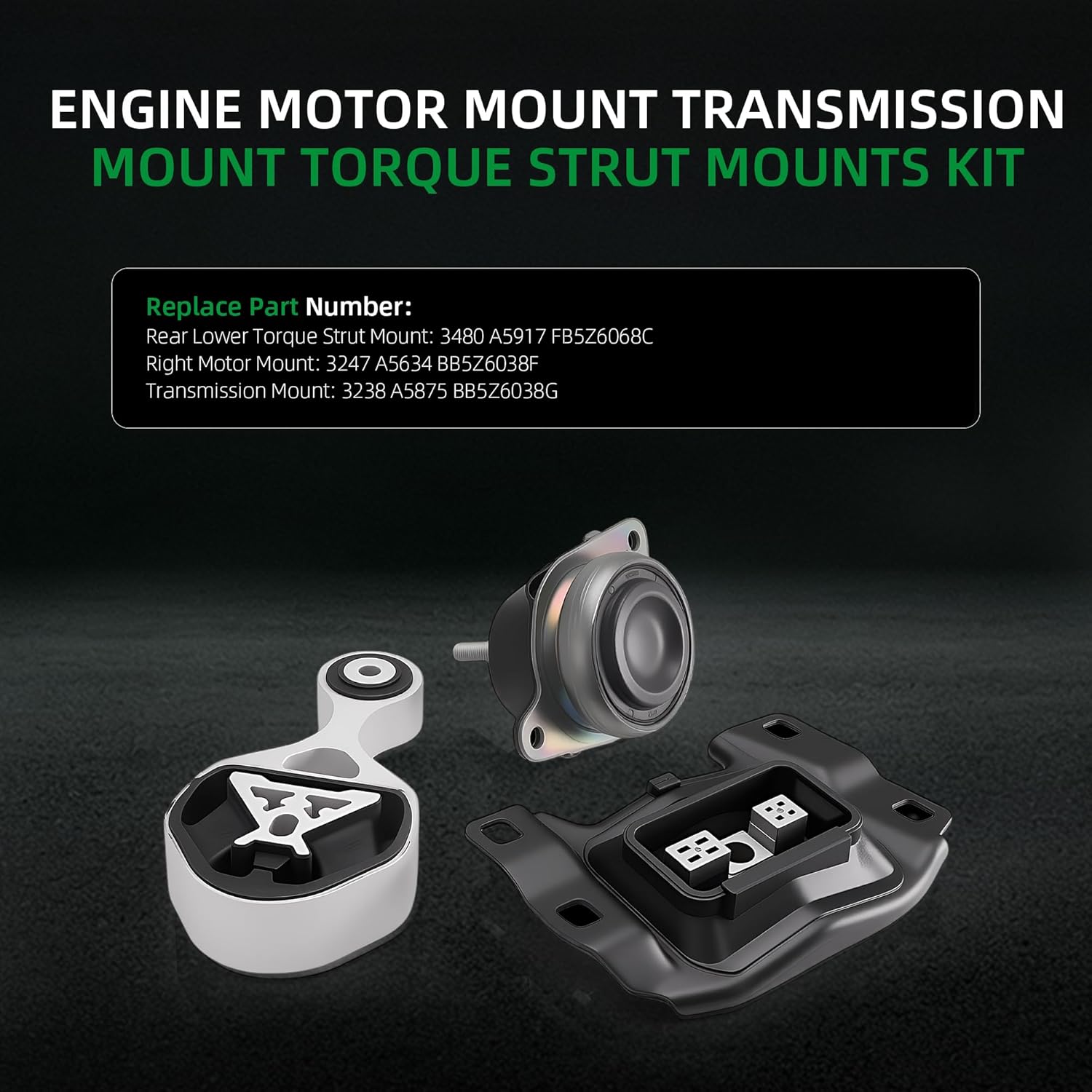 | Included Components | 1x Rear Lower Torque Strut Mount -- 3480/A5917, 1x Right Motor Mount -- 3247/A5634, 1x Transmission Mount -- 3238/A5875 |