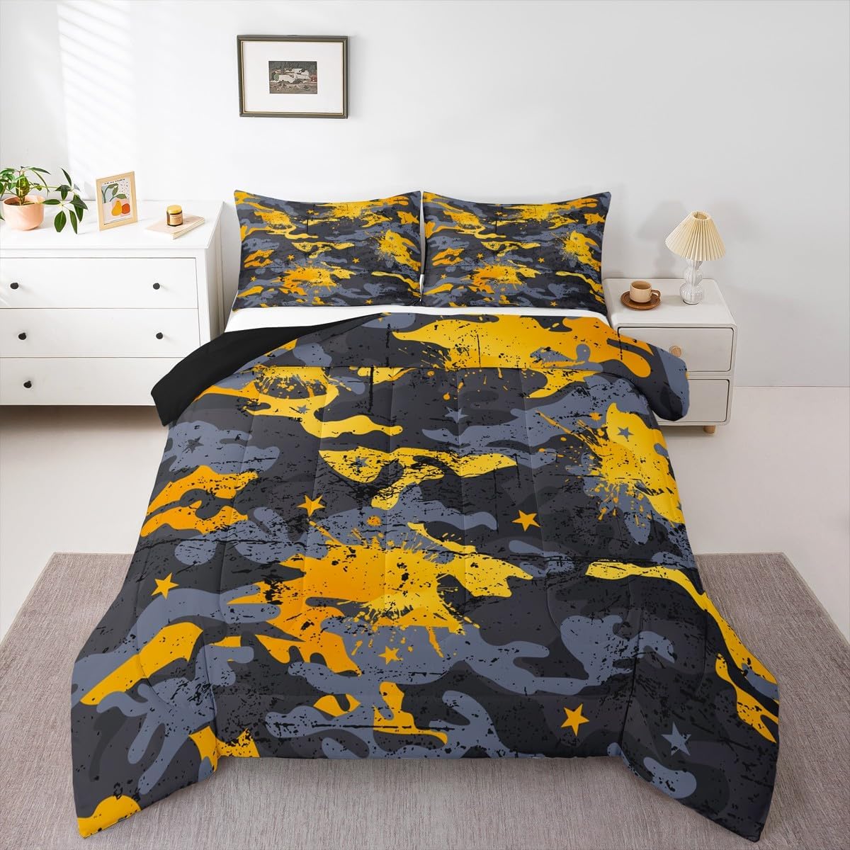 Size Information Toddler : 1 Comforter 42"x58" and 1 Pillowcase 30"x20" Twin : 1 Comforter 68"x90" and 1 Pillowcase 30"x20" Full : 1 Comforter 79"x90" and 2 Pillowcases 30"x20" Queen : 1 Comforter 90"x90" and 2 Pillowcases 30"x20" King : 1 Comforter 104" x90" and 2 Pillowcases 36"x20" Style Variety: Available in multiple styles. Suitable Spaces: For use in bedrooms, guest rooms, living rooms, or RVs. Printing Process: Manufactured using reactive printing and dyeing technology. Design Feature: Diverse pattern options. Care Property: Care Instructions: Machine washable. Air dry. Low-heat ironing recommended. Not suitable for bleach, dry cleaning, or machine drying. Intended Decor: Designed for home textile applications.