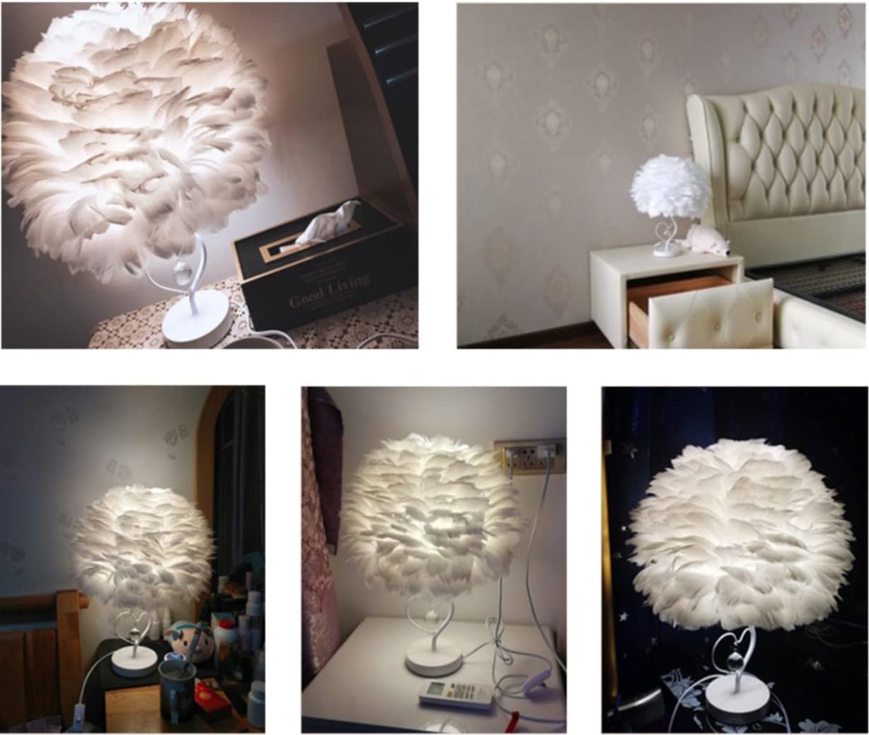 ★FEATURES:▸ This is a perfect home decoration lamp that not only provides soft lighting, but also adds a warm atmosphere to your home.▸ Carefully selected suitable sizes pieces of goose feathers, pure white, which are even and full, not easy to fall off, multi-layer distributed hand-woven, making the lighting more layered and beautiful.★PARAMETER:[Name]: Feather Bedside Lampshade[Material]: Goose feathers, Acrylic, Metal[Size]: lampshade size: 30cm/11.9" (D), 20cm/7.9 (H), Lamp height: 45cm/17.8", base diameter: 12cm/4.8".[LED Holder]: E27 for Europe, E26 for America[Type of Bulb]: LED light bulb, 5W, Warm light[Color]: White[Style]: Modern & Simple Luxury [Shipping Weight]: 940g [Suitable for]: Living Room, Bedroom, Bar, Restaurant, Hotel,ect★PACKAGE INCLUDED: 1 x Feather Bedside Lampshade★NOTE▸ When you just unpack, please take the lampshade to the open space and shake the feathers.▸ The falling feather when shaking is normal and inevitable and not a quality problem. Please feel free to use it.