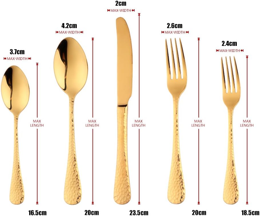Description: This amazing cutlery set is best described as contemporary and timeless, with a luxe look. Your set will be one-of-a-kind, customized for you and will come clean, sterilized, polished and ready to use. all with a mirror polished finish for a sophisticated appearance, creating an unforgettable tabletop presentation is always effortless. No silverware set is the same, what you get is unique! If you are looking for a special way to thank your dinner guests, let them take their set home as an luxurious gift or wedding favor... Feature: STURDY - High quality 18/8 stainless steel, durable for your daily use, Last for years, Bend resistance DESIGN - Hammered, Shinny appearance with mirror polish, Which makes your table settings elegant and different. VERSATILE - Perfect for daily use, parties, gathering, casual or formal occasion. TECHNOLOGY - Smooth edge with no rough marks, Never need re-polish EASY CLEAN - Easy and convenient to clean by hand wash and also dishwasher safe, will not flade or scratch. MEET DIFFERENT DEMAND - With unique colors to meet different demand. PACKAGE CONTENTS: Dinner Knife: Length 9.25 inch Dinner Spoon: Length 7.87 inch Dinner Fork: Length 7.87 inch Salad Fork: Length 7.32 inch Teaspoon: Length 6.50 inch WHAT'S INCLUDED: -4 x Dinner Knif. -4 x Dinner Fork -4 x Salad Fork -4 x TeaSpoon -4 x Dinner Spoon. USING INSTRUCTION: 1.Please wash the butter Knife sets with warm soapy water before first using to wash off any processing residue left from manufacturing. 2.Please use a neutral detergent to wash the silverware set after using and dry it before storage.