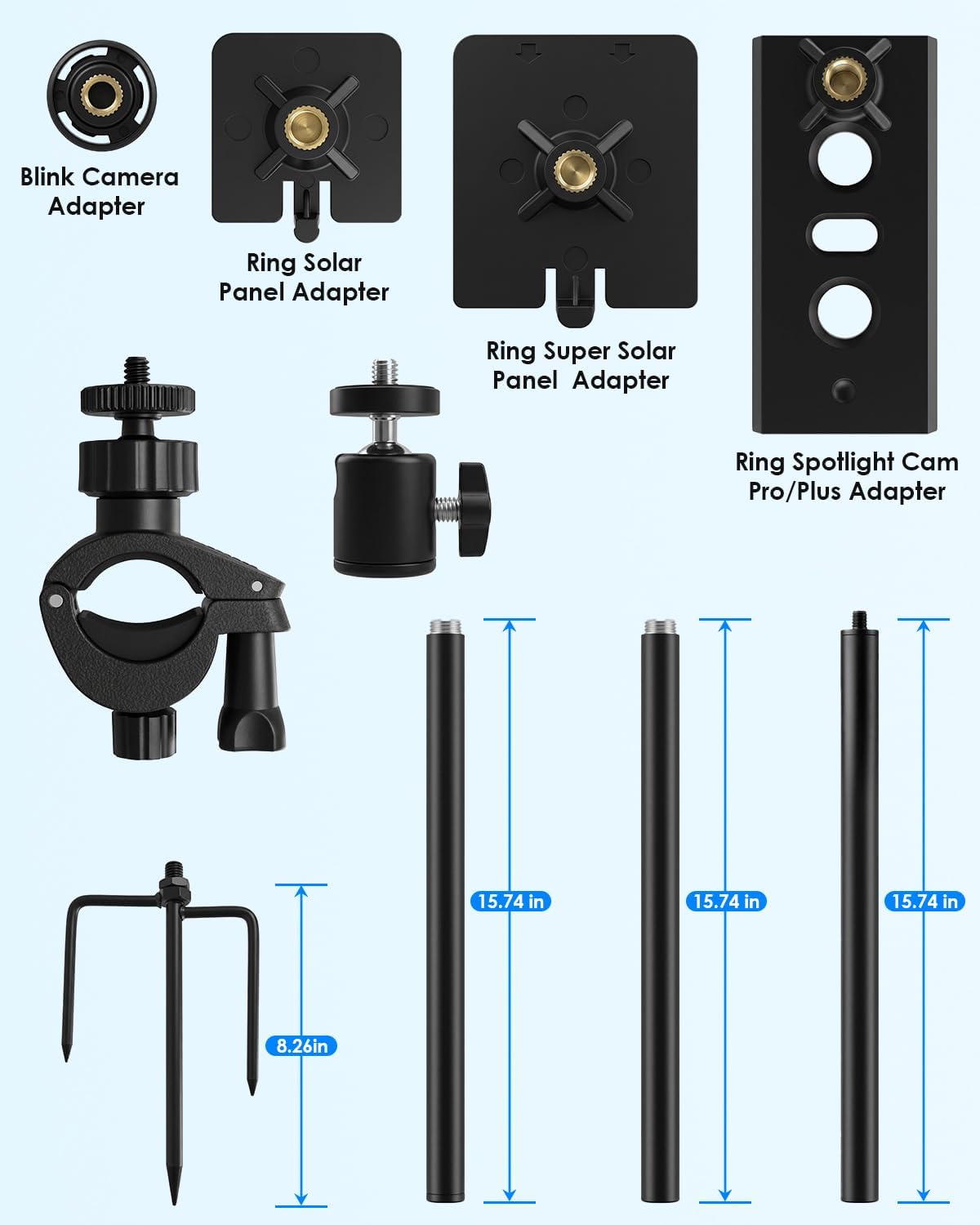 • Wide Compatibility: Equipped with industry-standard 1/4”-20 mounting screws, the ground stake is fully compatible with Ring (Stick Up Cam/Spotlight Cam), Blink Outdoor, Arlo, SimpliSafe, and most mainstream security cameras, as well as the majority of solar panels available on the market. Included adapters ensure a hassle-free, tool-free setup.