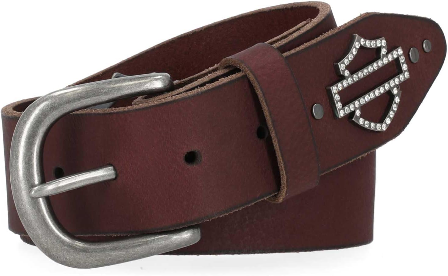 Harley-Davidson Women's Genuine Leather Belt - Brown. BMW032/01. Open Bar & Shield logo design, with rhinestone accents. Interchangeable belt buckle. Made from 100% genuine leather. Antique nickel finish. 38mm wide. Waist Size: Small 32"/82cm, Medium 34"/87cm, Large 36"/92cm, XL 38"/97cm, 2XL 40"/102cm.
