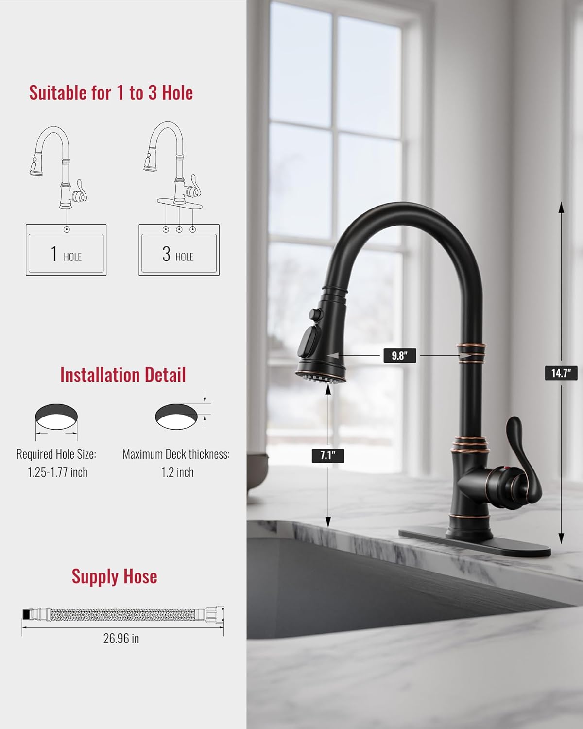 | Included Components | Bronze kitchen faucet with sprayer, Deck Plate, Handle, Hose, Mounting Hardware |