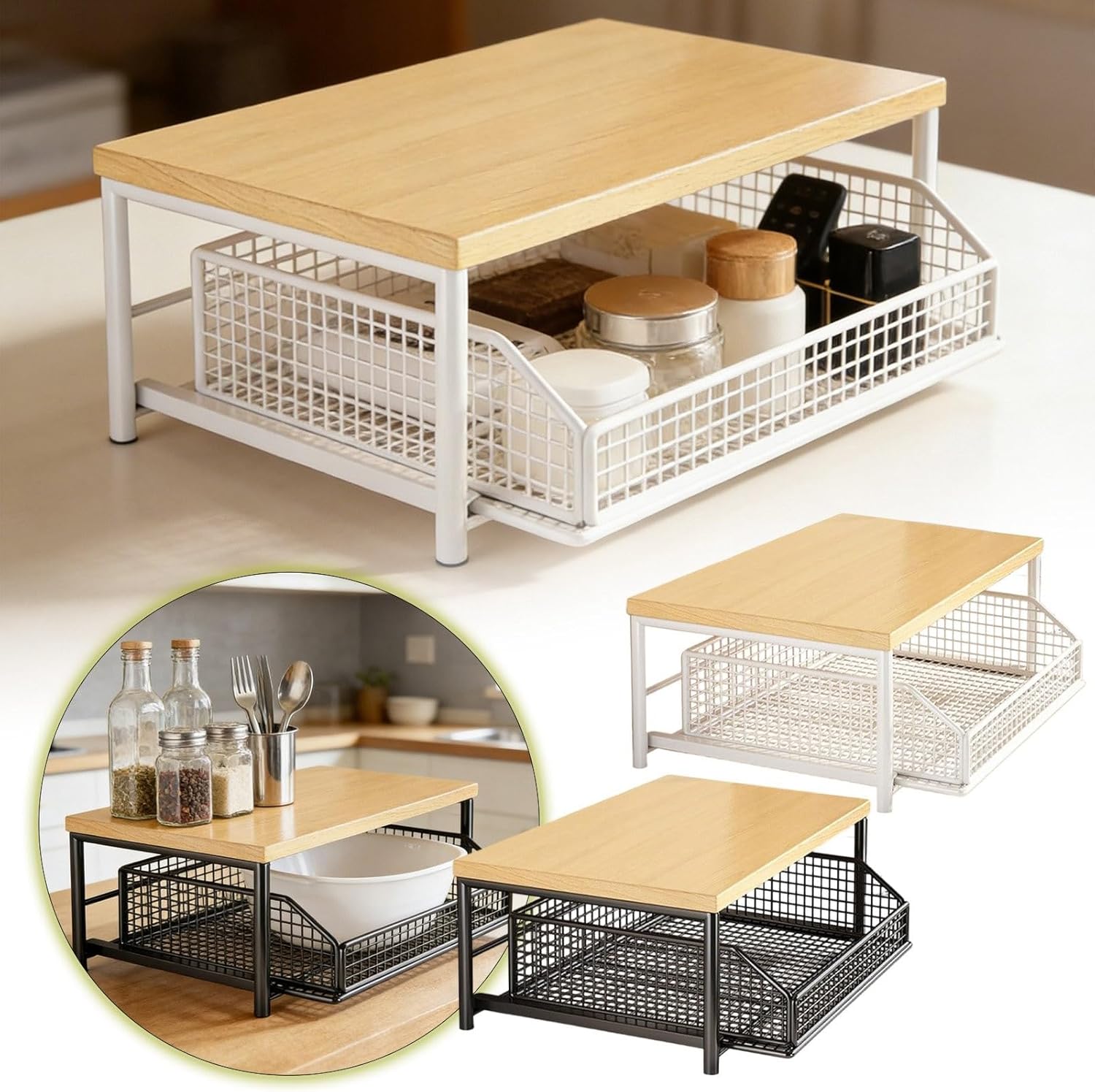 Kitchen Countertop Organizer with Sliding Drawer and Wire Basket, Hardwood Shelf Storage for Coffee Maker, Space-Saving Design, 14.35x10.23x7.08 Inches Transform your kitchen countertop into an organized oasis with this versatile storage solution. The thoughtfully designed organizer combines a sturdy hardwood shelf with a sliding wire basket drawer, maximizing vertical space while keeping essentials within easy reach. Perfect for supporting coffee makers, toaster ovens, or microwaves on top, while the spacious pull-out drawer below provides convenient storage for utensils, dishes, or pantry items. Built with durability in mind, the robust construction features a solid hardwood surface measuring 14.35 x 10.23 inches, with a practical height of 7.08 inches. The sleek metal frame and wire basket design offer both style and functionality, making it ideal for modern kitchens. Whether you're storing appliances, organizing cooking supplies, or displaying spice jars, this space-saving organizer helps maintain a clutter-free countertop while adding a touch of contemporary charm to your kitchen decor. Assembly is straightforward, and the smooth surfaces make cleaning a breeze. SPACE-SAVING DESIGN: Compact countertop organizer maximizes vertical space with dimensions of 14.35 x 10.23 x 7.08 inches, perfect for small kitchens and limited counter areas while keeping appliances and essentials within easy reach DUAL STORAGE SOLUTION: Features a smooth-sliding wire basket drawer that provides versatile storage options for coffee makers, spices, utensils, bowls, and kitchen accessories, keeping your countertop clutter-free and organized DURABLE HARDWOOD CONSTRUCTION: Built with a sturdy hardwood shelf top and robust metal frame that supports heavy kitchen appliances while maintaining stability, ensuring long-lasting performance for daily kitchen use VERSATILE KITCHEN ORGANIZER: Ideal for storing coffee makers, toaster ovens, spice jars, utensils, and other kitchen essentials, with an open wire basket design that allows easy visibility and access to stored items EASY ASSEMBLY AND MAINTENANCE: Simple setup requires no professional installation, and the smooth hardwood surface allows for quick and convenient cleaning to maintain a hygienic kitchen environment