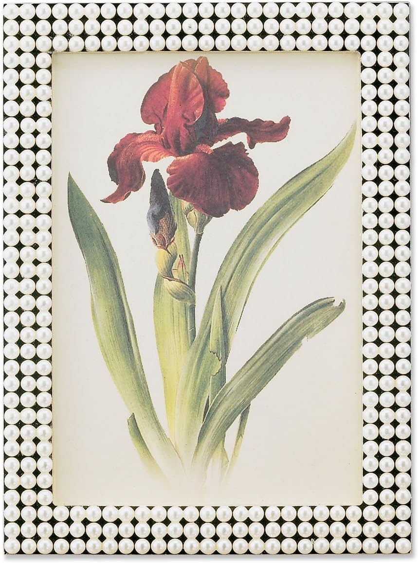 Gorgeous quality cast silver metal 5x7 picture frame decorated with ivory pearls and includes high quality velvet easel backing for vertical or horizontal tabletop display. Comes individually boxed.