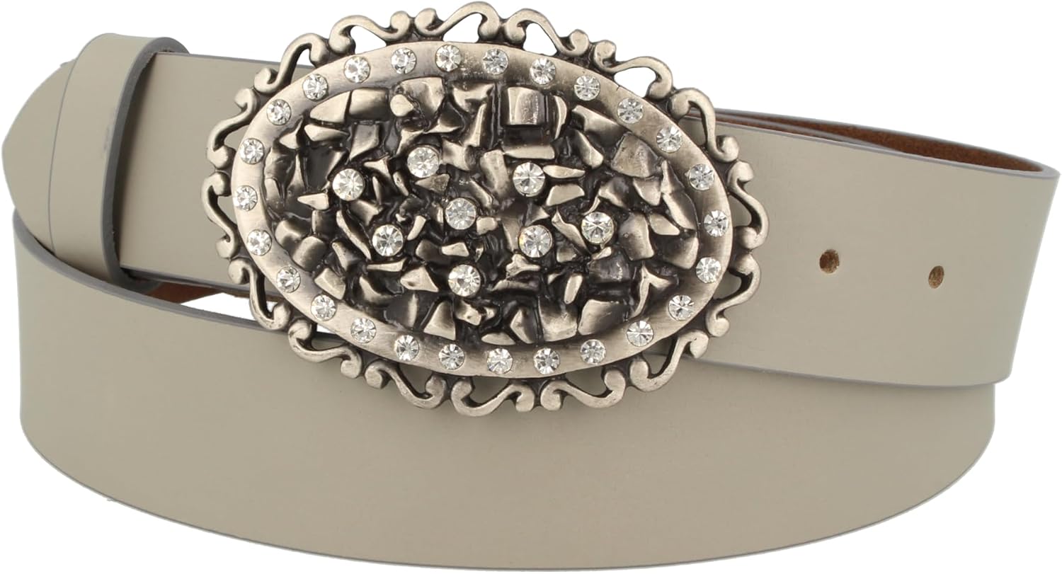 4 cm wide. This belt impresses with its soft leather and the elaborately designed clasp with a little rhinestone. The rhinestones have a special cut and thus underline the high-quality clasp. This belt is also very suitable for wearing over blouses, tunics or dresses. Can be shortened by the screw system.
