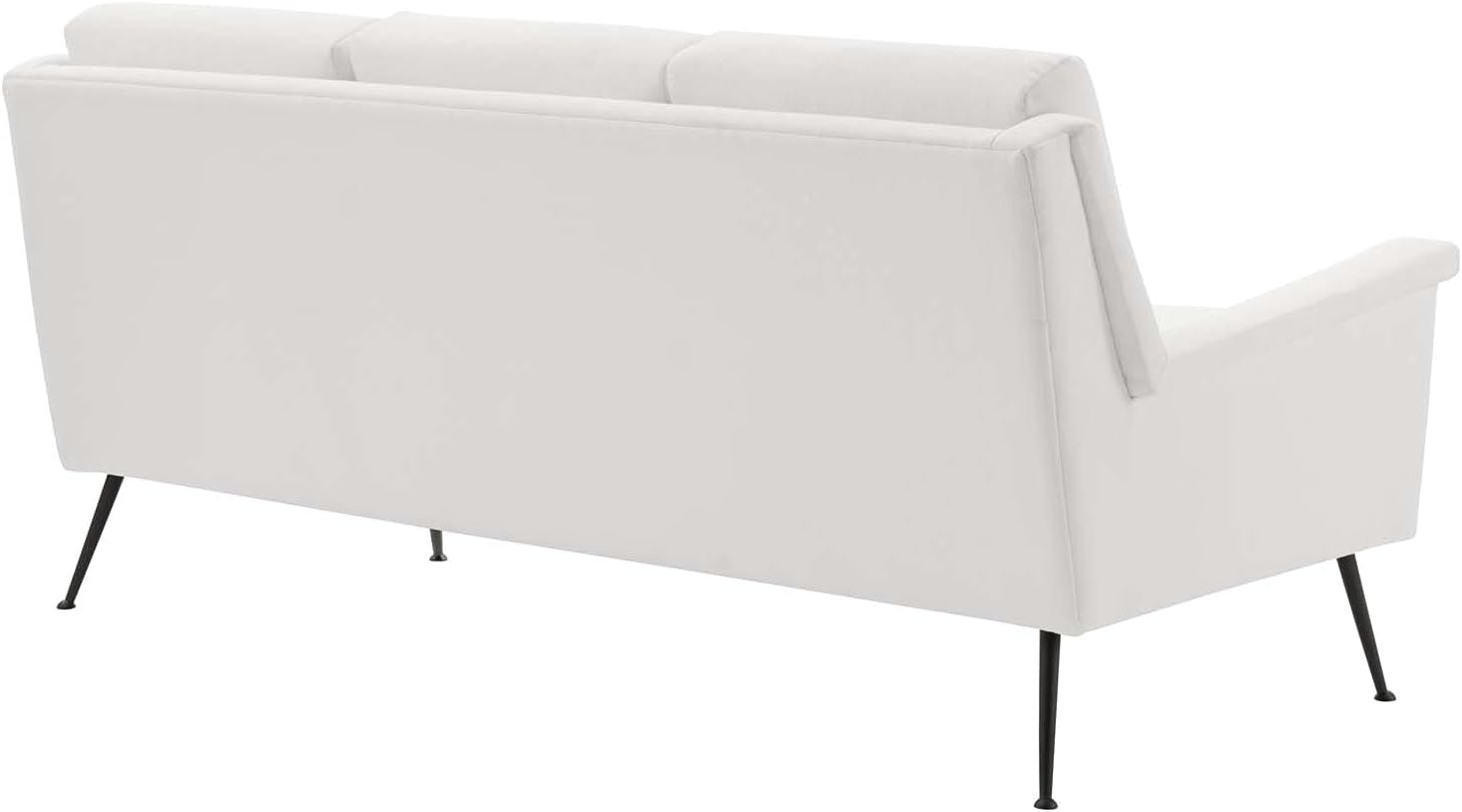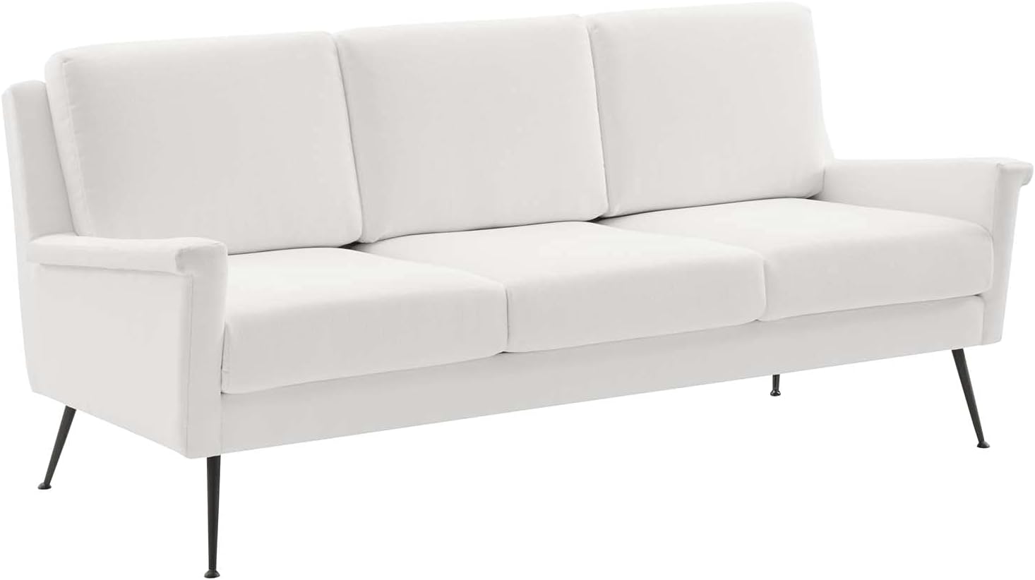 Redefine your living space with the modern design and retro style of the Chesapeake Fabric Sofa. Featuring a tailored profile and subtle flared silhouette, this fabric sofa refreshes a living room, den, office, or bedroom sitting area. Offering a luxurious seating experience, this sofa is upholstered in durable polyester fabric and padded with dense foam for ultimate comfort. Resting atop matte black metal legs, this living room sofa is crafted with solid wood and plywood and supports up to 600 lbs.
