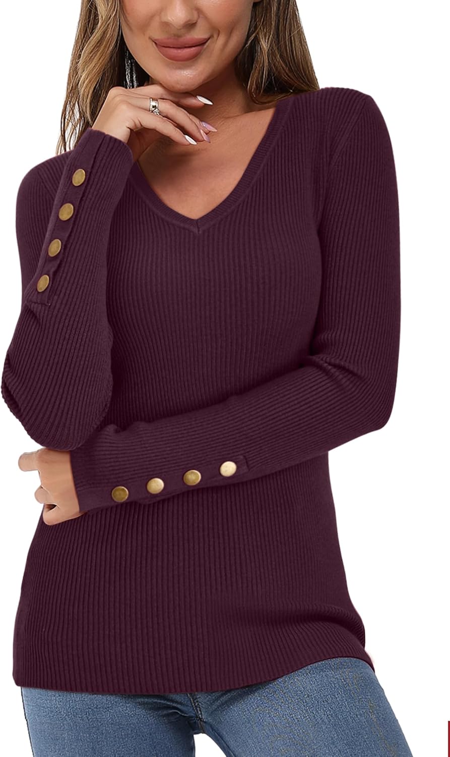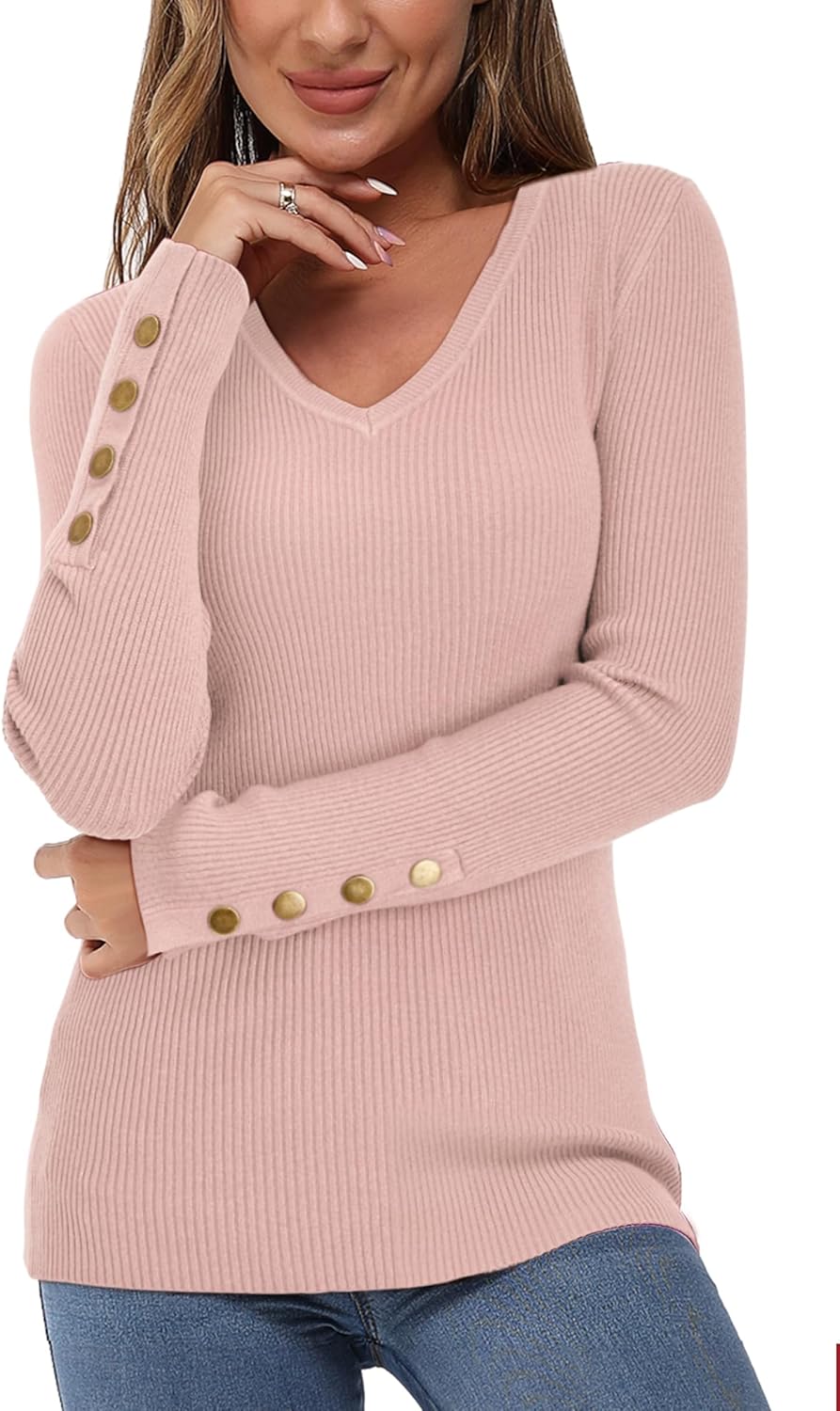 Newshows Womens Sweaters Fall V Neck Pullover Long Sleeve Stretch Button Casual Ribbed Knit Tops