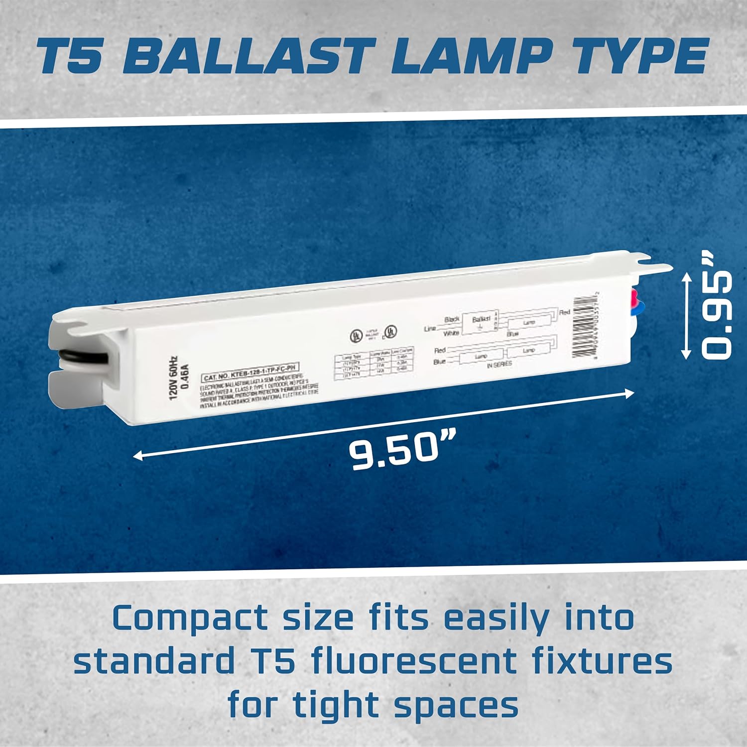 Upgrade your lighting solutions with the OHLECTRIC Replacement for Keystone KTEB-128-1-TP-FC-PH /D Electronic Fluorescent Ballast, specifically engineered for T5 lamps. This high-performance ballast operates at 28 watts and is designed to work with a voltage range of 120 volts (±10%), making it suitable for various residential and commercial applications. Featuring a rapid start method, it provides quick lamp ignition for instant brightness, enhancing the efficiency of your lighting setup. The ballast maintains a normal ballast factor and power factor, ensuring consistent light output while minimizing energy consumption. Safety is a top priority; this model is UL listed and RoHS compliant, meaning it meets rigorous safety and environmental standards. Additionally, it includes thermal protection to prevent overheating, ensuring long-lasting operation and reliability. With compact dimensions of 0.76 inches in height, 0.91 inches in width, and 5.9 inches in length, the OHLECTRIC ballast is designed to fit easily into various fixtures without sacrificing performance. The mounting dimension of 5.60 inches and the included finger case style further facilitate straightforward installation. It operates effectively in a wide temperature range, with a minimum starting temperature of 0ºF (-18ºC) and a maximum case temperature of 167ºF (75ºC), ensuring functionality in diverse environments. The ballast is equipped with standard lead lengths, including 16 inches for black and white wires, 40 inches for the blue wire, and 17 inches for the red wire, providing flexibility for installation. Ideal for applications ranging from office lighting to retail environments, the OHLECTRIC KTEB-128-1-TP-FC-PH /D Electronic Fluorescent Ballast delivers exceptional performance, safety, and versatility, making it an excellent choice for upgrading your lighting systems. Trust the OHLECTRIC for reliable, efficient lighting solutions that enhance your space.