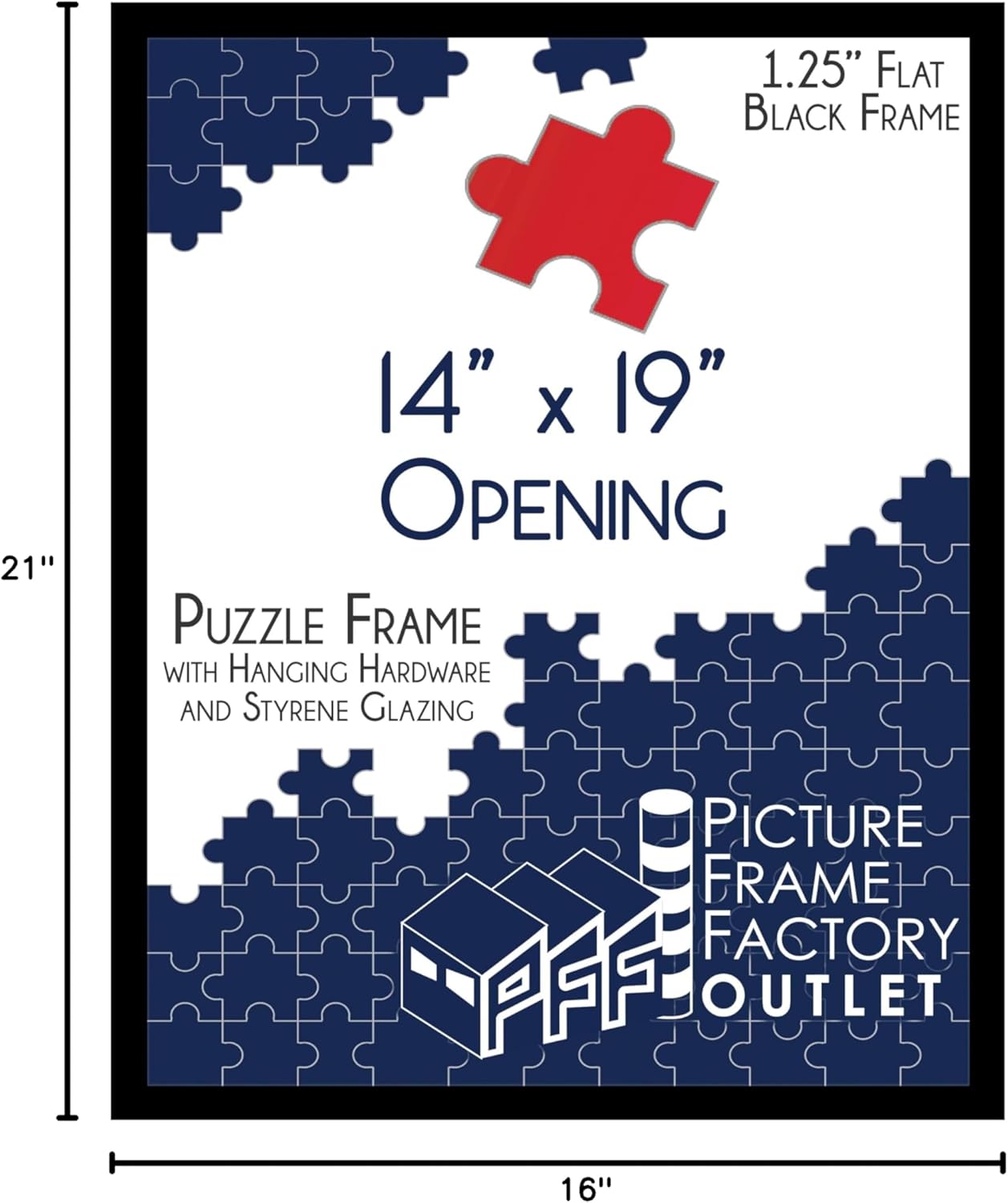 This picture frame has a 14 inch x 19 inch opening. The 1.25 inch wide black picture frame is intended for use of framing jigsaw puzzles, art, posters, photos, and various home decor. Transform your cherished artwork, puzzles, posters, and memories into a stunning display with our 14 inch x 19 inch opening black puzzle frame. Showcase your treasures with this sleek, modern black satin finish frame, as it complements any home decor, making it ideal for your favorite puzzles, art, posters, family photos, certificates, and more. This frame is constructed from a durable eco-friendly recycled mdf. The crystal-clear plexiglass enhances the beauty of your displayed items while ensuring it arrives blemish-free. Remove the protective film from both sides to reveal a crystal clear view. Each frame comes with an easy-to-install hanging wire kit, allowing you to choose between vertical or horizontal orientation. We provide a strong and rigid cardboard backing that will keep your cherished memories flat and in place. This frame is carefully packaged to ensure safe transit to your door. Embrace the elegance of our 14x19 inch black puzzle frame and turn your memories into a captivating art pieces. Add to cart now and create a gallery that tells your unique story. Elevate your home decor with our premium 19 inch x 14 inch opening frame.