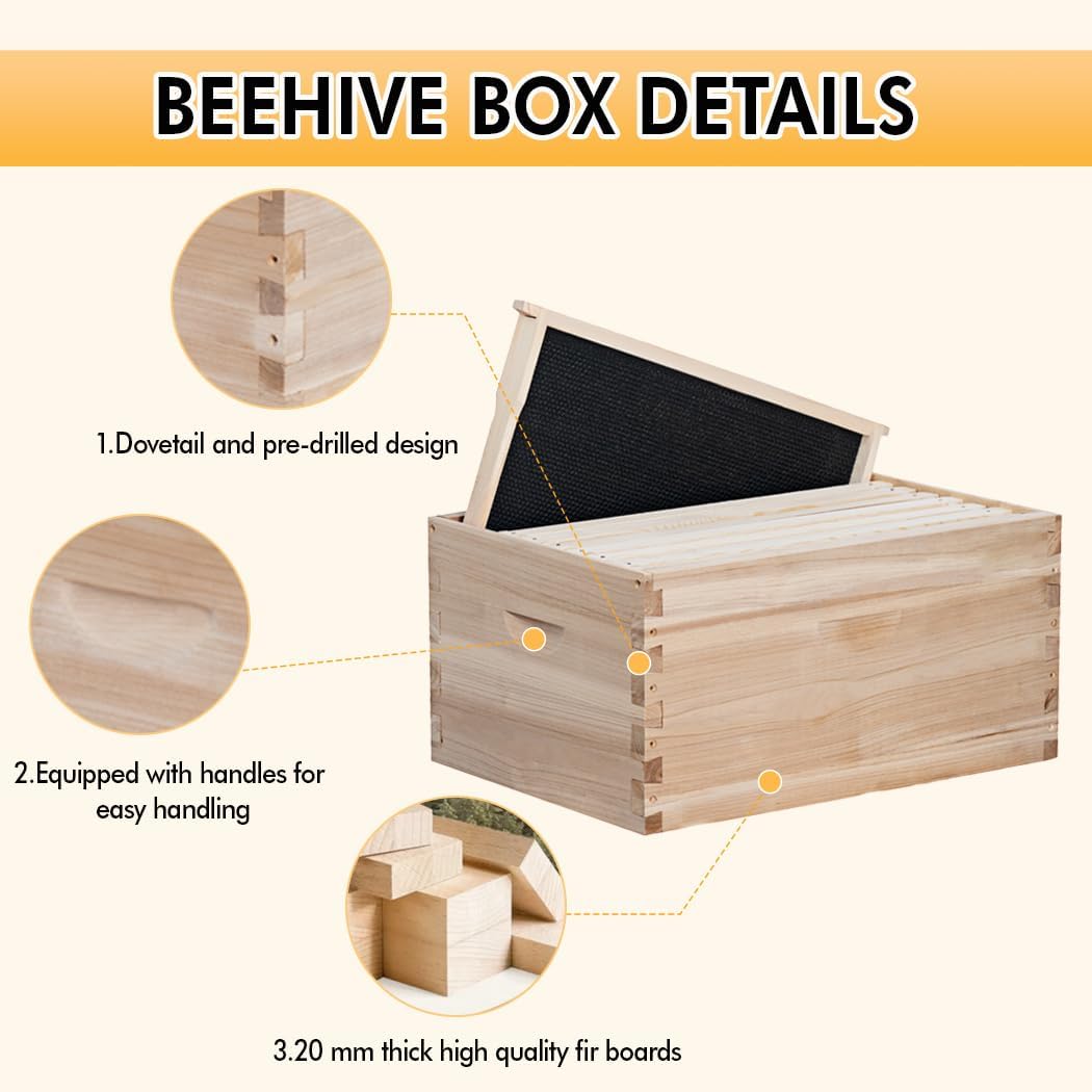 POLLIBEE 8 Frame Deep Bee Hive Box, Langstoth Deep Brood Bee Box for Beekeeper,Include Beehive Frames and Wax Foundations (unassembled)