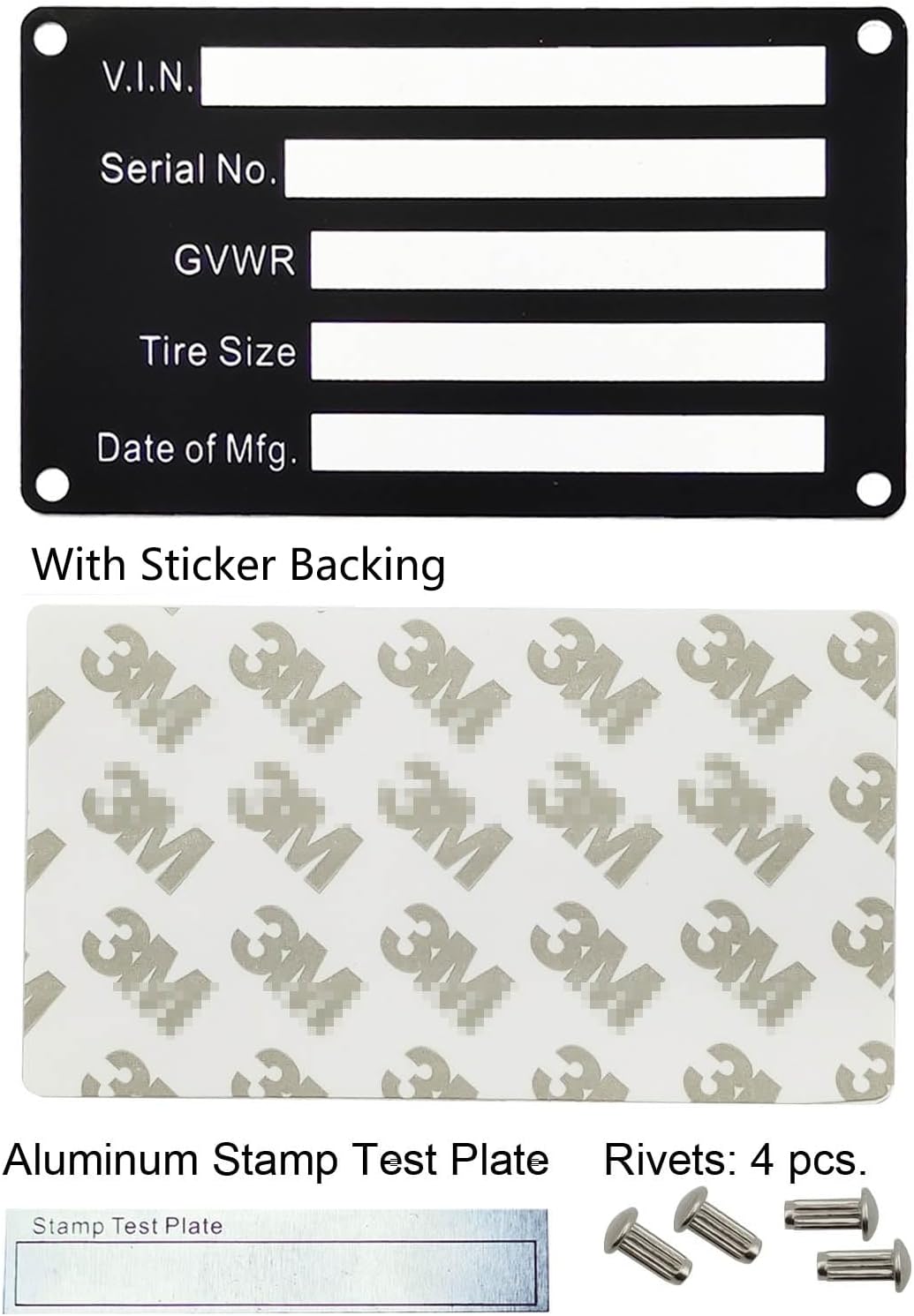 This trailer VIN ID plate is made from high quality aluminum and is highly durable. It is designed to meet or exceed DOT/SAE standards for safety and durability. The plate is 6 inches wide and 3 inches high, with a matte black finish that will not fade or chip over time. The plate is easy to install, and comes with all necessary hardware and instructions. It is perfect for use on trailers, cargo carriers, trucks, buses, boats, and other vehicles. The plate is also customizable, with up to 8 lines of text for you to include your trailer's VIN, model, date of manufacture, GVWR, and other important information.