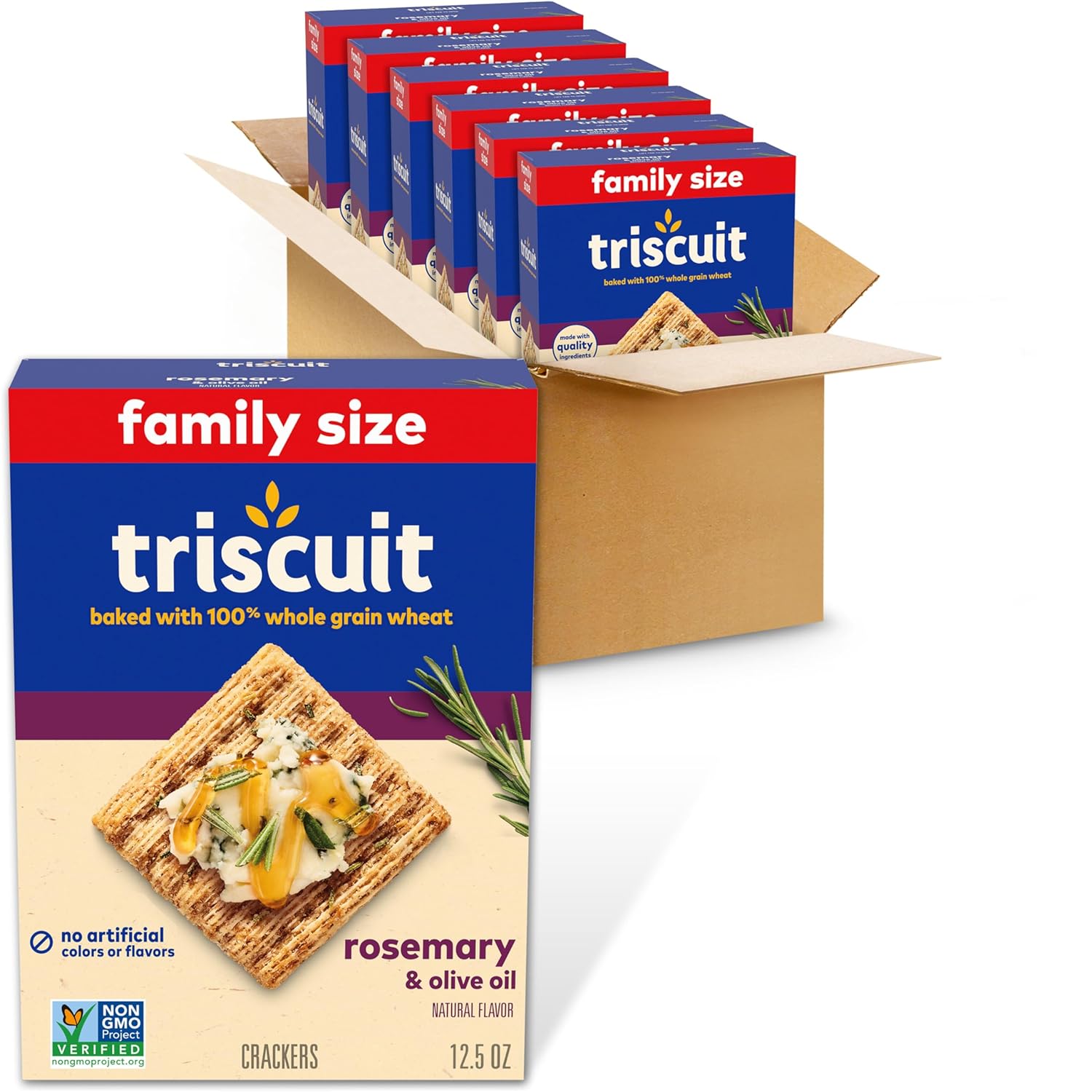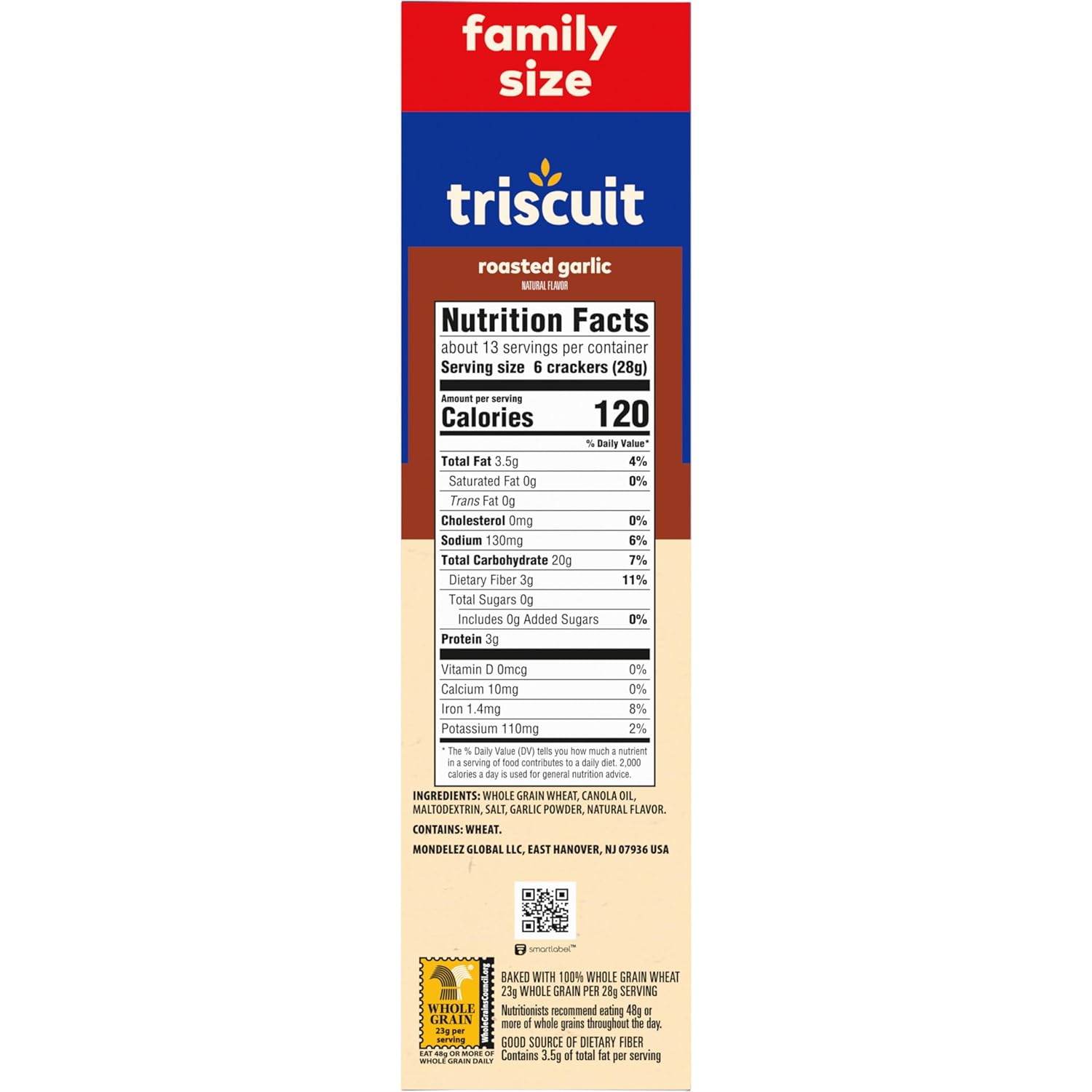 Triscuit Roasted Garlic Whole Grain Wheat Crackers are made simply with quality ingredients. Baked to perfection, these snack crackers use 100% whole grain wheat proudly grown in the USA and sunflower oil. The square snack crackers are made with their signature woven texture for a satisfying crunch. Roasted Garlic Triscuit crackers are Non-GMO Project Verified, made without artificial colors or flavors and a good source of dietary fiber (see nutritional information for fat content) for delicious wholesome goodness. Enjoy the crunch of these delicious crackers on their own, or top with your favorite cheese, fruit, or flavorful spreads. Triscuit cracker snacks cover all of your snacking needs, whether you need lunch snacks for kids, snacks for adults or on the go snacks for traveling. Serve these bulk crackers at parties by creating a delicious charcuterie board featuring Triscuit crackers alongside your favorite cheese, meat, fruit, and vegetables for an easy appetizer.