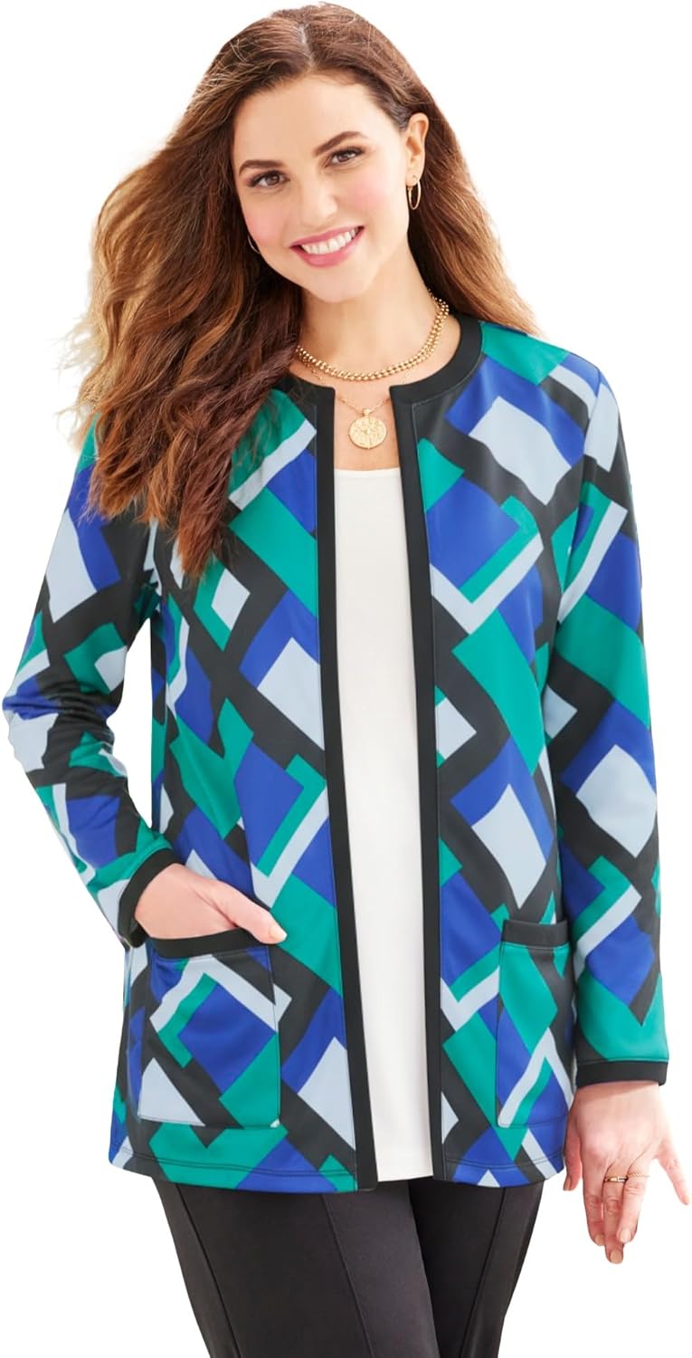 There’s something so wonderfully elegant about a blazer that commands everyone’s attention with its quiet, chic attitude. This blazer proves the point. Designed with our soft and stretchy ponte fabric, it’s styled with a jewel neckline, contrast piping, and patch pockets, and is cut close to the body with a comfy, flattering fit, that seems to automatically elevate the look of any outfit, as if right on cue. FABRIC: Our Ponte fabric is so soft and smooth, with the perfect amount of stretch that gracefully follows your form, giving you all the comfort and ease you love. FIT: Relaxed silhouette, Hook-and-Eye closure at neck, long sleeves, straight hem. Contrast piping detail. Patch pockets. 73% Polyester/22% Rayon/5% Spandexbr>Machine washbr>Imported Plus Size Blazerbr>30" Lengthbr>Plus Sizes 0x-6xbr>Catherines