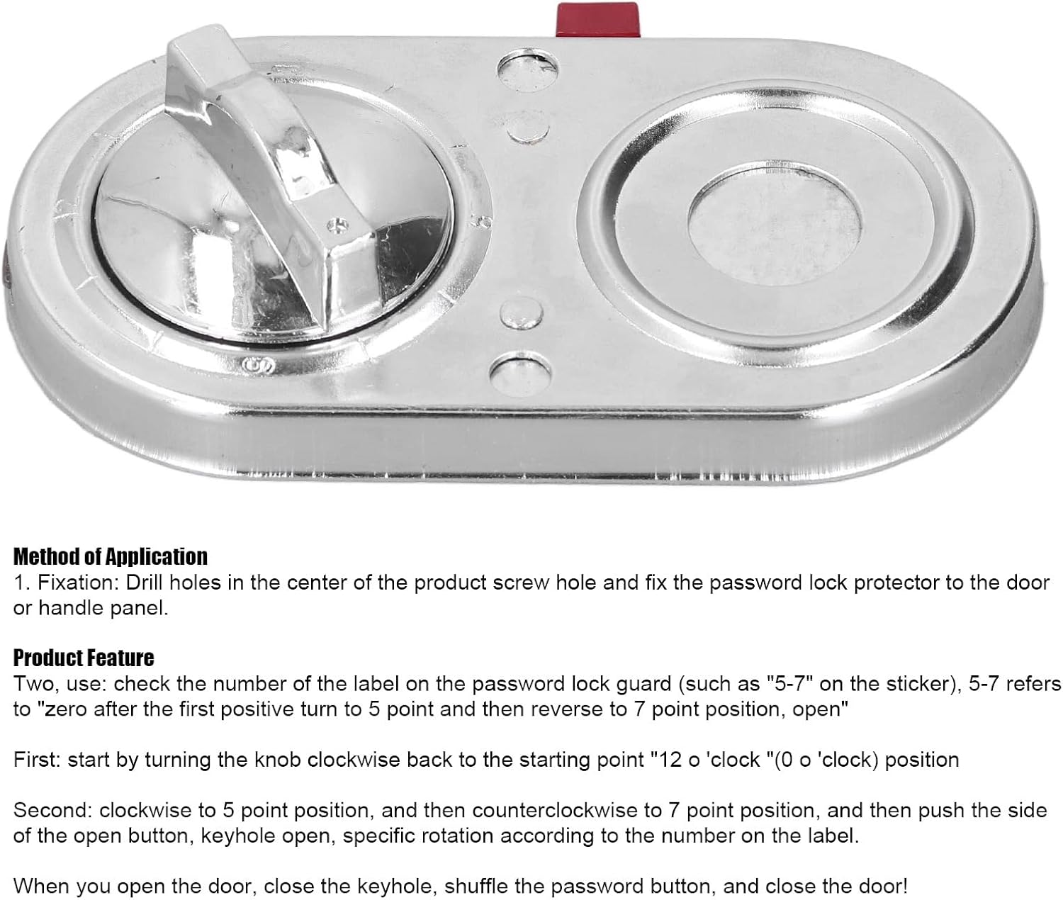 How to Use: 1. Fixation: Drill holes in the center of the product screw hole and fix the password lock protector to the door or handle panel. 2. Use: check the number of the label on the password lock protector (such as 9‑1 on the sticker), 9‑1 refers to zero after the first positive turn to 9 point and then reverse to 1 point position, open. First: start to dial the knob clockwise back to the starting point 12 (0) position, second: clockwise to 9, and then counterclockwise to 1, and then push the side of the open button, keyhole open, specific rotation according to the label on the number. When you open the door, close the keyhole, the password button, and close the door! Specification: Item Type: Keyhole Protector Material: Iron Color: Silver Size: Approx. 120x63x11mm / 4.7x2.5x0.4in Package List: 1 x Keyhole Protector