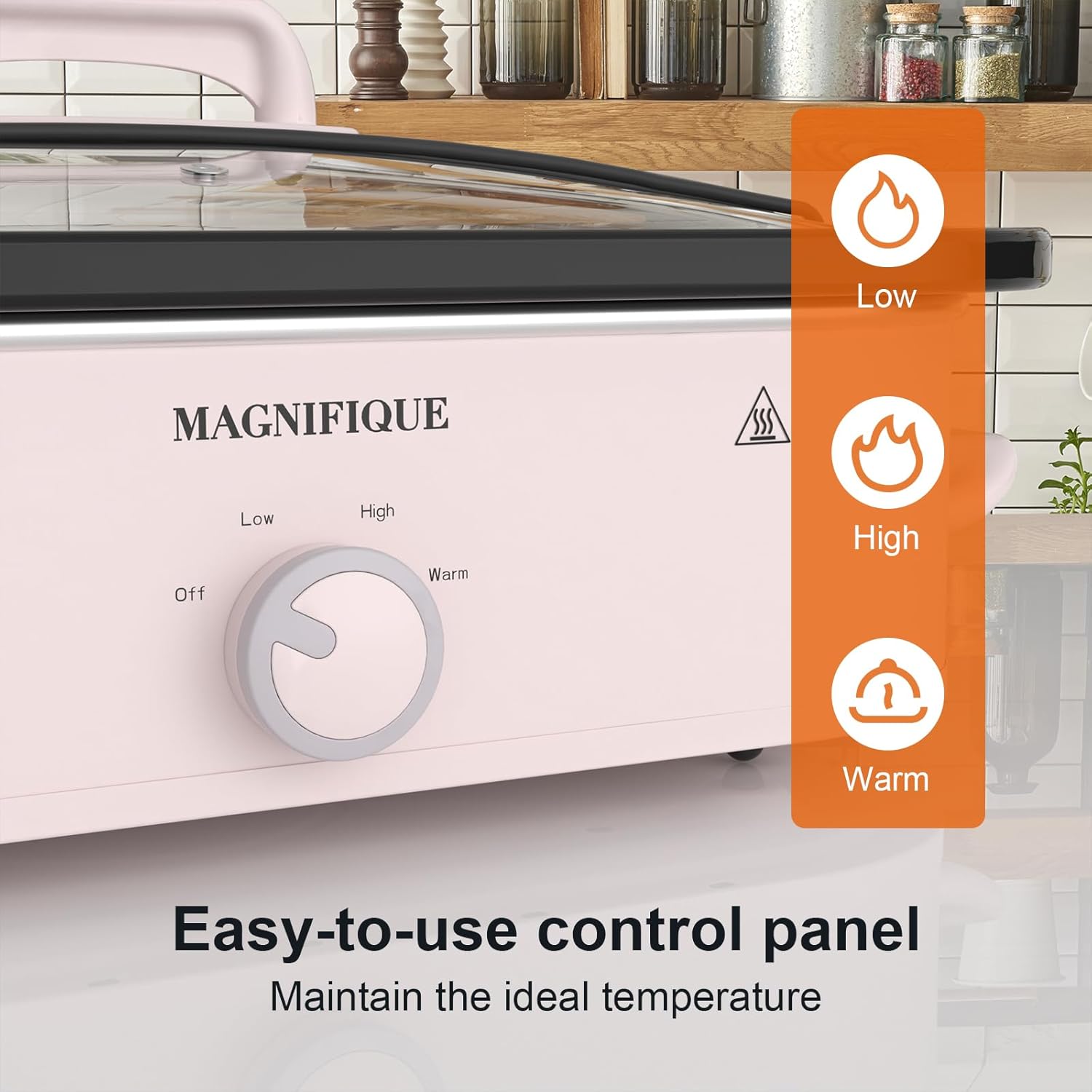 MAGNIFIQUE 4 Quart Slow Cooker with Ceramic Nonstick Baking Dish, Adjustable Temperature, Oven Safe for Lasagna & Roasts, Dishwasher Safe Stoneware & Tempered Glass Lid, Compact Crock Pot, Pink