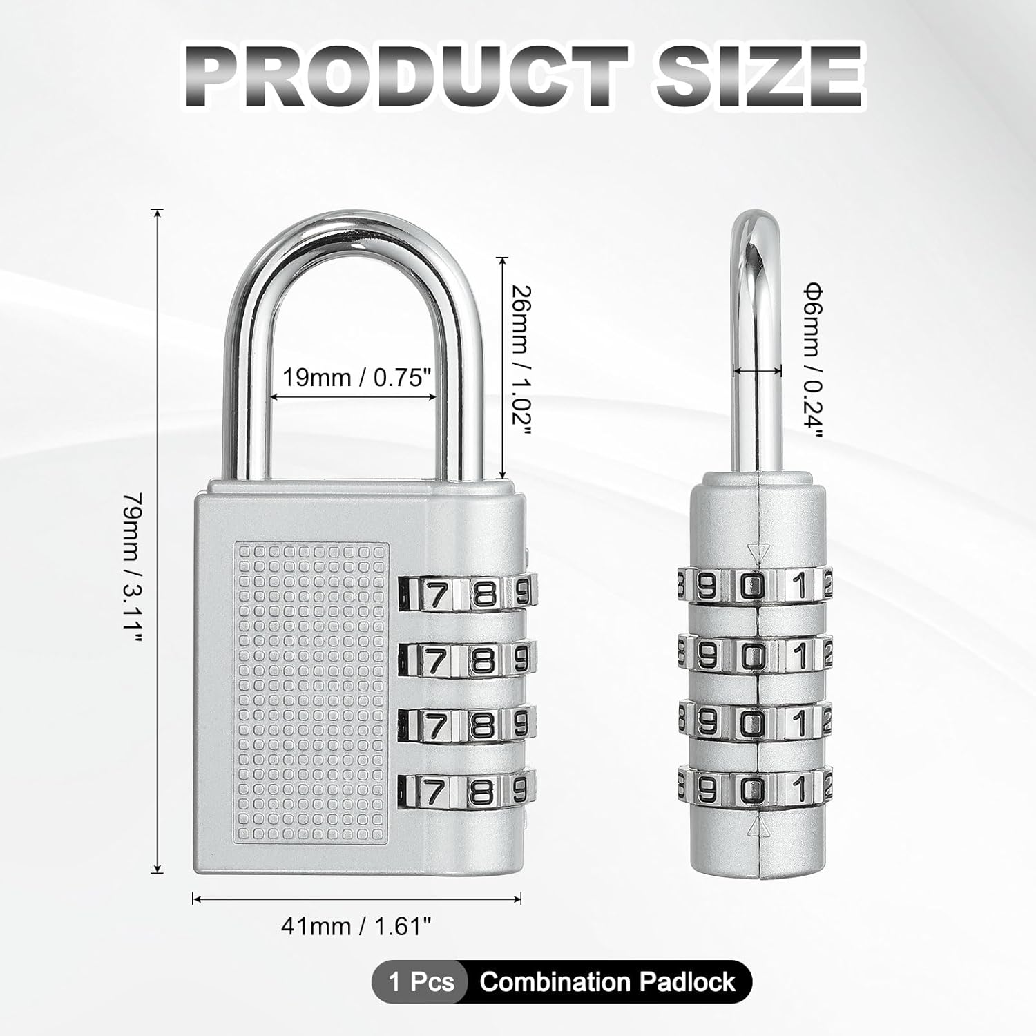 Reasons for Selection - This combination padlock features a durable zinc alloy body and a sturdy stainless steel shackle, making it excellent for cut and saw resistance, as well as water and rust resistance. This combination lock is compact, lightweight, and features a 4-digit combination, which to 10000 password combinations can be set, making it difficult to crack.Specifications -Material: Zinc Alloy; Color: Silver; Size: 41 x 79 mm / 1.61 x 3.11 inch(W*H); Inner Size: 19 x 26 mm / 0.75 x 1.02 inch(W*H); Shackle Diameter: 6 mm / 0.24 inch; Package Includes: 1 Pcs x Combination PadlockSuitable For -This shackle code lock is perfect for securing gym lockers, luggage, suitcases, storage boxes, toolboxes, cabinets, fences, outdoor gates, sports equipment, and backpacks. It's a suitable security accessory for personal, travel, home, and institutional use.Usage Tips -Reset the combination to the factory default (0000), then open the shackle and rotate it 90 degrees counterclockwise. Then, press and firmly hold the shackle down. While holding it down, turn the dials to set your new combination, aligning the chosen numbers with the arrow marks. Finally, release the shackle and lock it to complete the process.Kind Tips -Please carefully check the size information before purchasing to ensure the product fits you.
