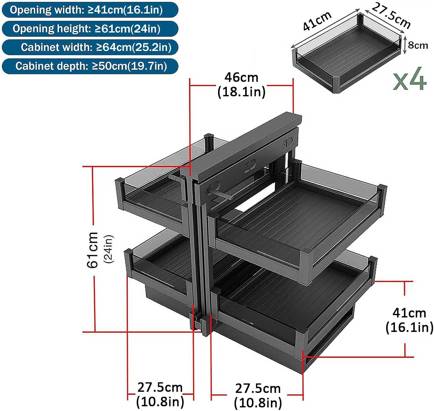 Transform your kitchen with our Corner Pull Out Baskets Shelving Unit, designed for both left and right-hand cabinets measuring 61-64cm. This innovative storage solution features four baskets that slide out smoothly, allowing you to maximize the often-overlooked blind corners in your kitchen cabinets. **Maximize Your Space** Are you struggling with limited kitchen storage? Our pull-out shelving unit is the perfect answer. It seamlessly extends from your cabinet, granting easy access to pots, pans, utensils, and spices that usually remain hidden. Each of the four adjustable aluminium alloy baskets is ideal for organizing everything from cooking essentials to small kitchen gadgets, making your cooking experience more efficient and enjoyable. **Durable and Stylish** Crafted from high-quality aluminium alloy and reinforced glass, our shelving unit not only provides strength and durability but also boasts a sleek, polished chrome finish that enhances your kitchen's aesthetics. With a load capacity of up to 80KG (176 lbs), this organizer is built to support your kitchen essentials while maintaining a stylish look. **Easy Installation** Setting up your new storage solution is a breeze. The pull-out cabinet organizer comes with everything you need, including four baskets for versatile storage options. Enjoy a clutter-free kitchen without the hassle of complicated assembly. **Perfect for Any Kitchen** Whether you're a culinary enthusiast or simply need better organization, our Corner Pull Out Baskets Shelving Unit is an invaluable addition to your kitchen. Say goodbye to cramped spaces and hello to a more functional and tidy cooking environment.